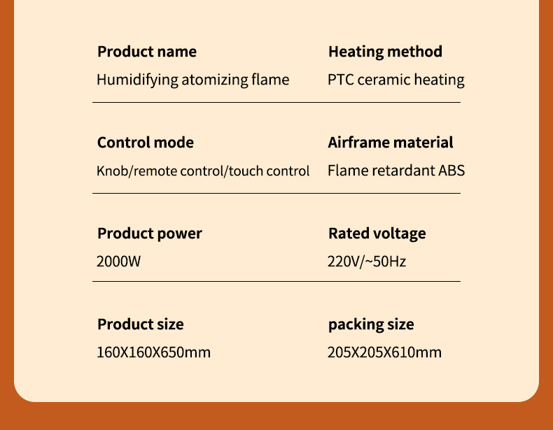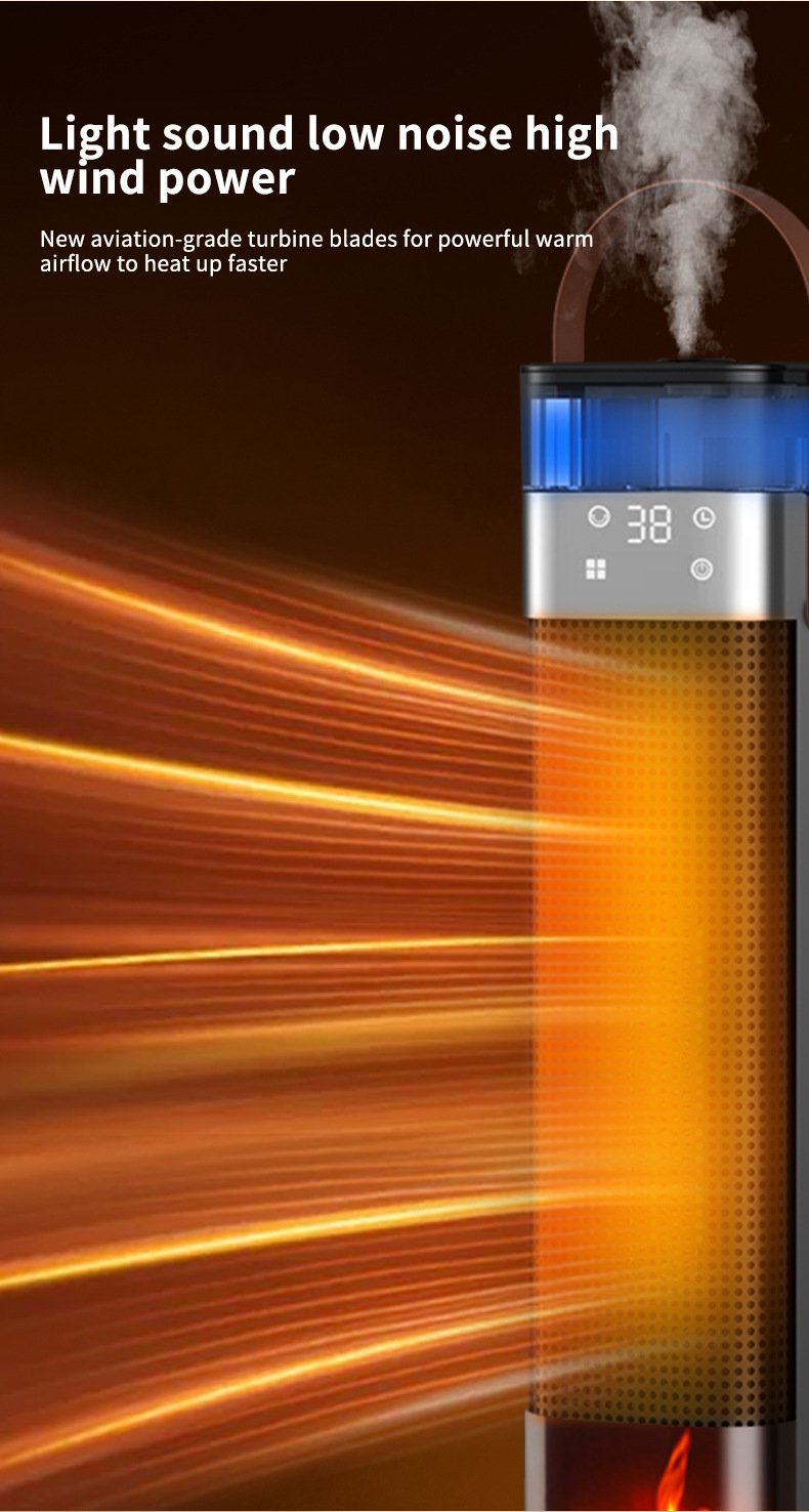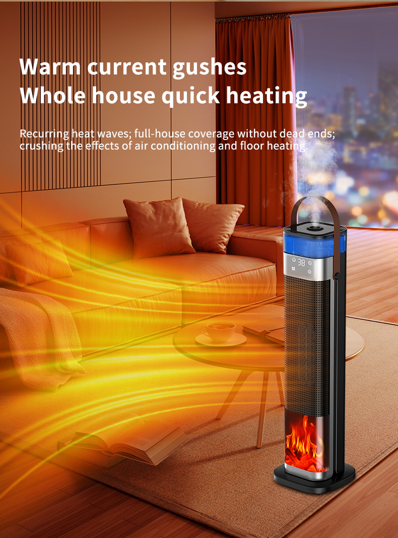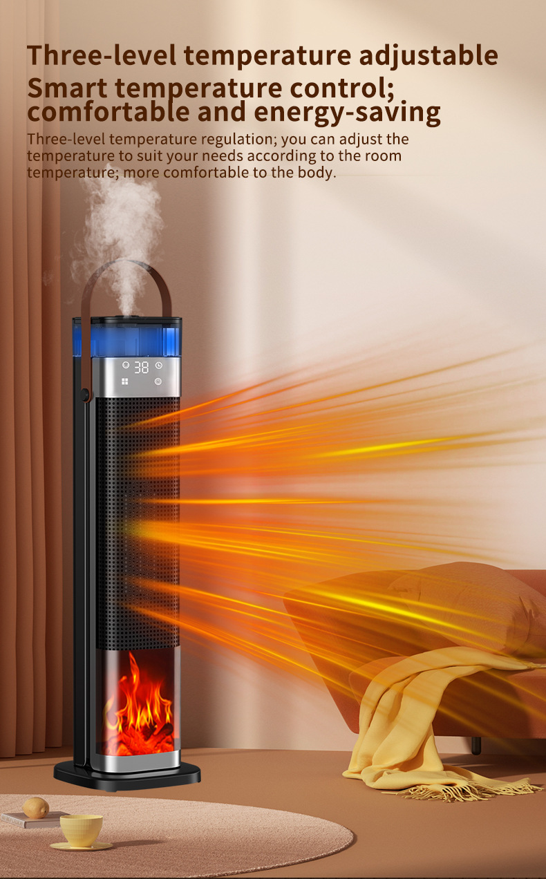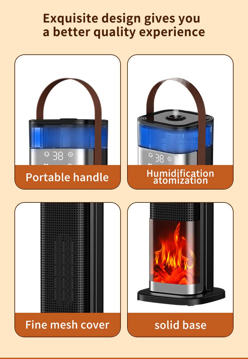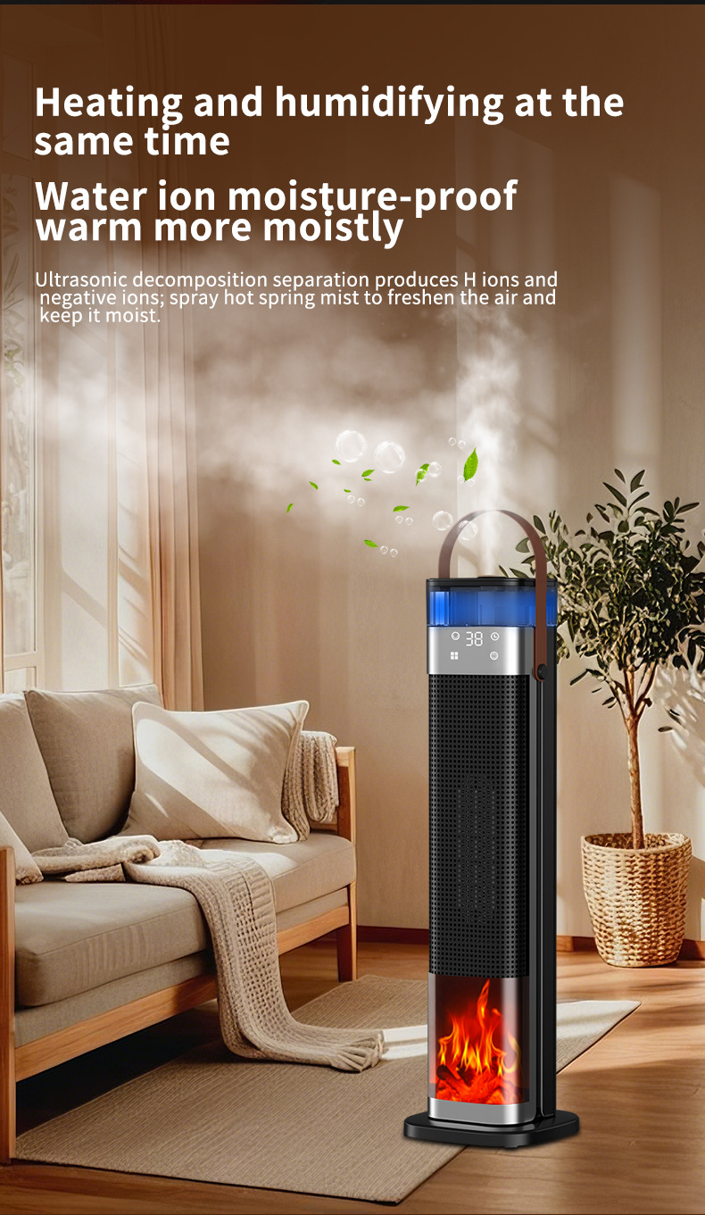 Product information: Heating Method: PTC semiconductor ceramic heating element Noise: below 36dB (including) Power type: AC Style: mechanical type, flame mechanical type Rated Voltage: 220 Additional features: spray humidification Air supply method: Shaking head Rated Power: 1500W (inclusive)-2000W (Exclusive) Operation mode: Knob type Applicable area: 21 ㎡ (inclusive)-30 ㎡ (inclusive) Size: 16x16x52.6cm Timing function: more than 8 hours Fan Speed Mode: 3 gears Material: Plastic