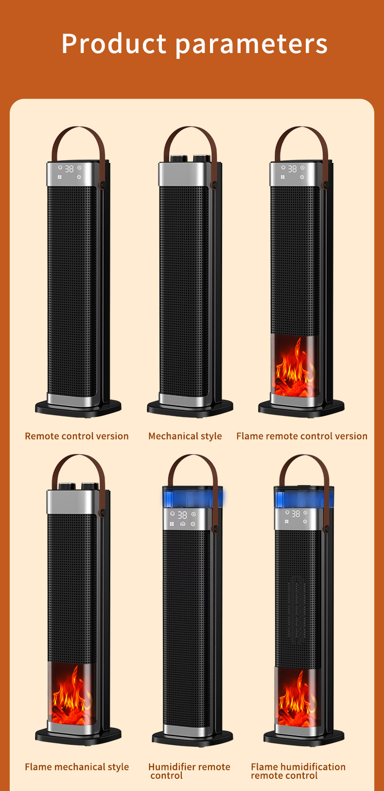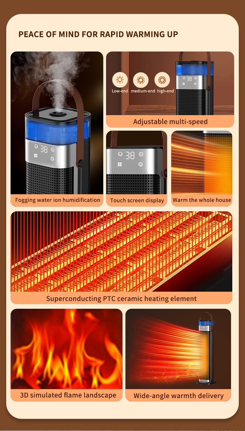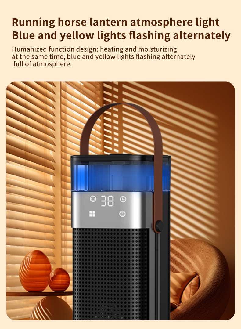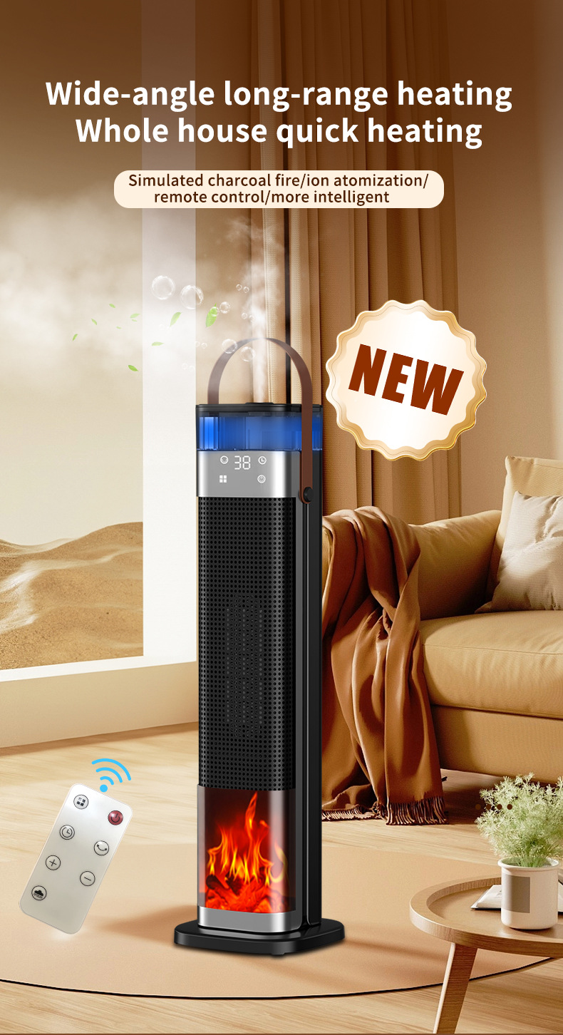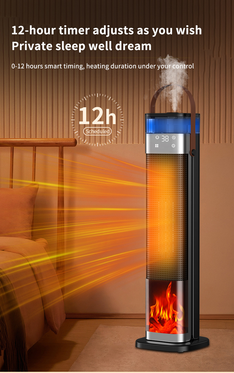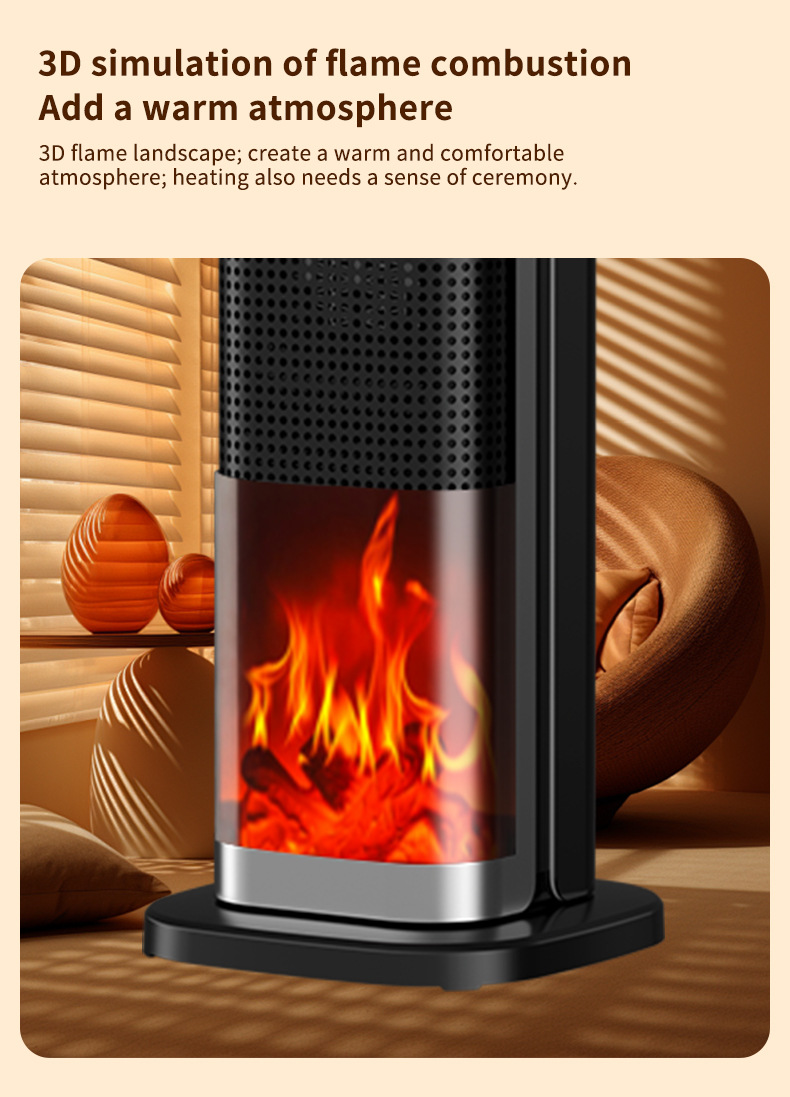Product information: Heating Method: PTC semiconductor ceramic heating element Noise: below 36dB (including) Power type: AC Style: mechanical type, flame mechanical type Rated Voltage: 220 Additional features: spray humidification Air supply method: Shaking head Rated Power: 1500W (inclusive)-2000W (Exclusive) Operation mode: Knob type Applicable area: 21 ㎡ (inclusive)-30 ㎡ (inclusive) Size: 16x16x52.6cm Timing function: more than 8 hours Fan Speed Mode: 3 gears Material: Plastic